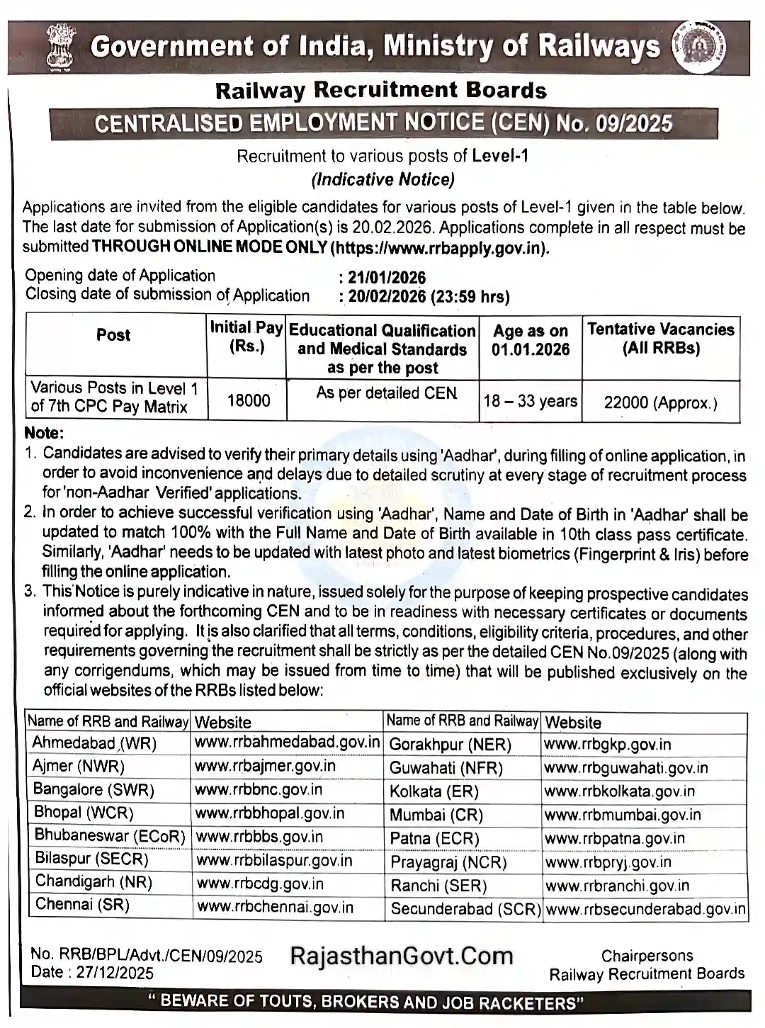 Railway Group D Recruitment 2026 रेलवे ग्रुप डी के 22,000 पदों पर निकली भर्ती, योग्यता 10वीं, ITI पास @rrbapply.gov.in रेलवे रिक्रूटमेंट बोर्ड (RRB) की ऑफिशल वेबसाइट पर ग्रुप डी के 22000 पदों पर सरकारी भारती का शॉर्ट नोटिफिकेशन पहले जारी कर दिया गया था और जिसका शॉर्ट नोटिफिकेशन 23 दिसंबर 2025 को ऑफिशल वेबसाइट जारी पर कर दिया गया है, अभ्यर्थी संपूर्ण जानकारी वेबसाइट पर देखें, रेलवे ग्रुप डी भर्ती 2026 के ऑनलाइन आवेदन 21 जनवरी से 20 फरवरी 2026 तक भरे जाएंगे, सभी महिला और पुरुष अभ्यर्थी जो दसवीं और आईटीआई पास किए हुए हैं वह इस भर्ती में शामिल हो सकते हैं, संपूर्ण जानकारी नीचे देखें